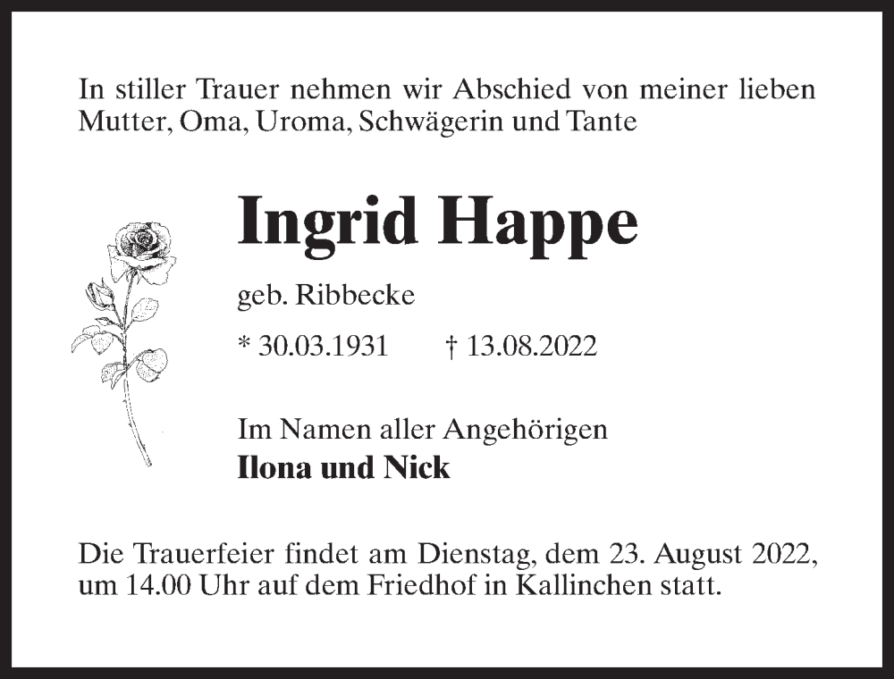 Hier finden Sie alle Traueranzeigen aus der Zeitung, die bisher für Ingrid Happe erschienen sind. Weitere Traueranzeigen, die in der Zeitung erscheinen, werden hier ebenfalls aufgelistet