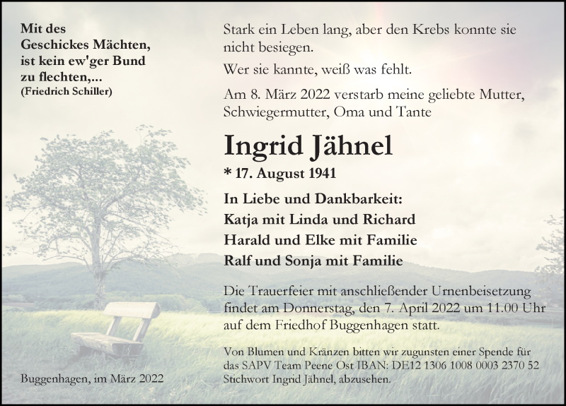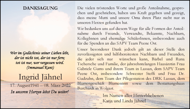 Hier finden Sie alle Traueranzeigen aus der Zeitung, die bisher für Ingrid Jähnel erschienen sind. Weitere Traueranzeigen, die in der Zeitung erscheinen, werden hier ebenfalls aufgelistet