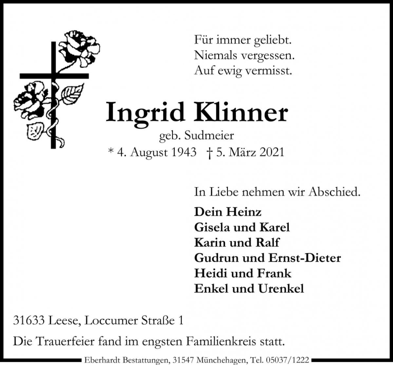 Hier finden Sie alle Traueranzeigen aus der Zeitung, die bisher für Ingrid Klinner erschienen sind. Weitere Traueranzeigen, die in der Zeitung erscheinen, werden hier ebenfalls aufgelistet