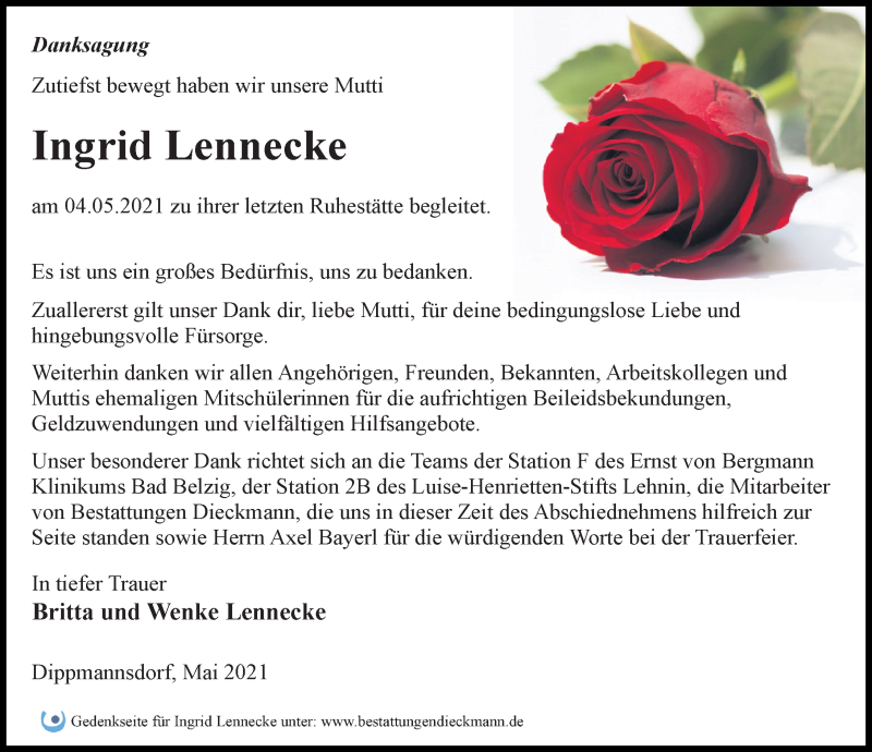 Hier finden Sie alle Traueranzeigen aus der Zeitung, die bisher für Ingrid Lennecke erschienen sind. Weitere Traueranzeigen, die in der Zeitung erscheinen, werden hier ebenfalls aufgelistet