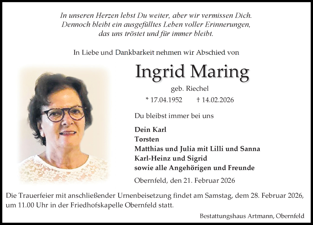 Hier finden Sie alle Traueranzeigen aus der Zeitung, die bisher für Ingrid Maring erschienen sind. Weitere Traueranzeigen, die in der Zeitung erscheinen, werden hier ebenfalls aufgelistet