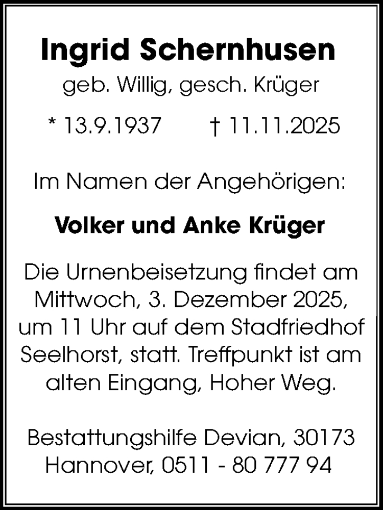 Hier finden Sie alle Traueranzeigen aus der Zeitung, die bisher für Ingrid Schernhusen erschienen sind. Weitere Traueranzeigen, die in der Zeitung erscheinen, werden hier ebenfalls aufgelistet