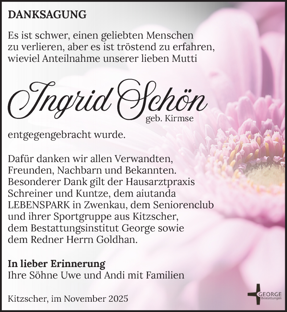 Hier finden Sie alle Traueranzeigen aus der Zeitung, die bisher für Ingrid Schön erschienen sind. Weitere Traueranzeigen, die in der Zeitung erscheinen, werden hier ebenfalls aufgelistet