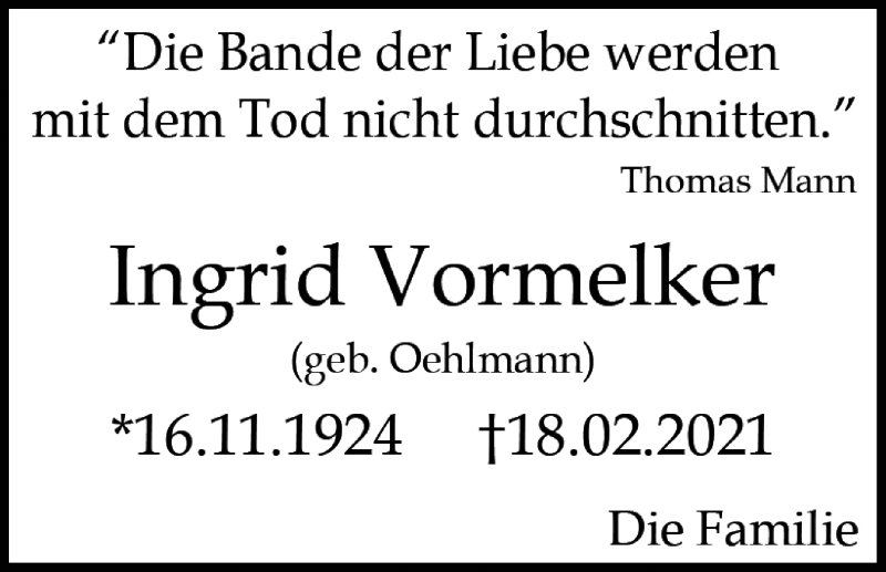 Hier finden Sie alle Traueranzeigen aus der Zeitung, die bisher für Ingrid Vormelker erschienen sind. Weitere Traueranzeigen, die in der Zeitung erscheinen, werden hier ebenfalls aufgelistet
