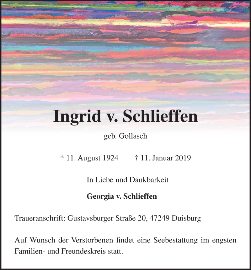 Hier finden Sie alle Traueranzeigen aus der Zeitung, die bisher für Ingrid v. Schlieffen erschienen sind. Weitere Traueranzeigen, die in der Zeitung erscheinen, werden hier ebenfalls aufgelistet