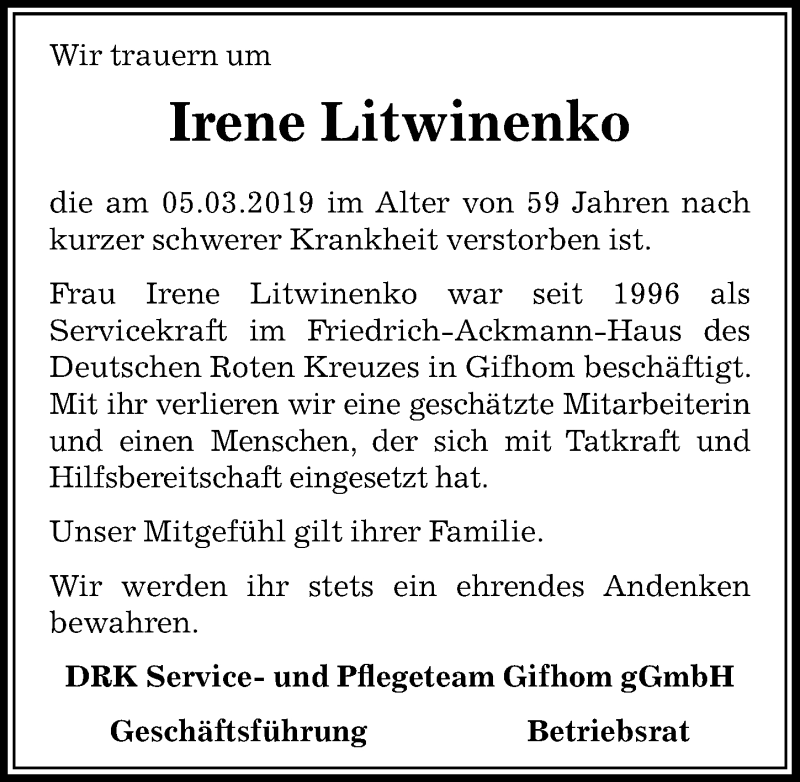 Hier finden Sie alle Traueranzeigen aus der Zeitung, die bisher für Irene Litwinenko erschienen sind. Weitere Traueranzeigen, die in der Zeitung erscheinen, werden hier ebenfalls aufgelistet