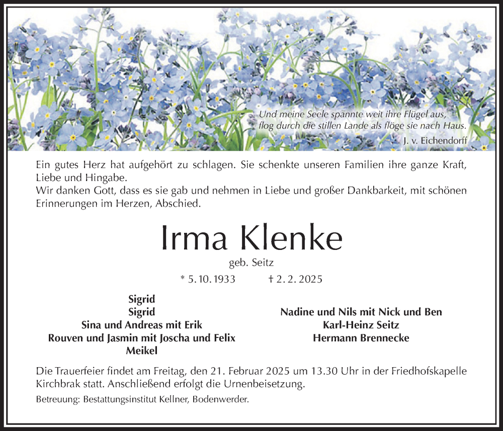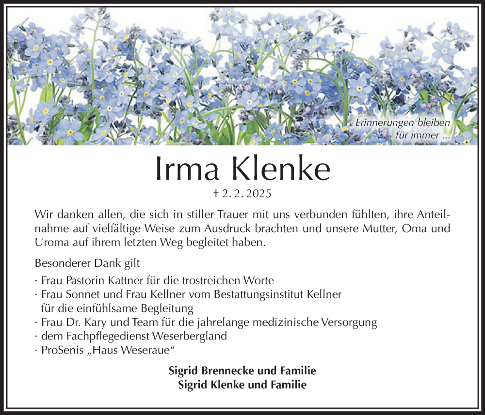 Hier finden Sie alle Traueranzeigen aus der Zeitung, die bisher für Irma Klenke erschienen sind. Weitere Traueranzeigen, die in der Zeitung erscheinen, werden hier ebenfalls aufgelistet