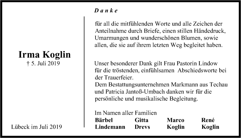 Hier finden Sie alle Traueranzeigen aus der Zeitung, die bisher für Irma Koglin erschienen sind. Weitere Traueranzeigen, die in der Zeitung erscheinen, werden hier ebenfalls aufgelistet
