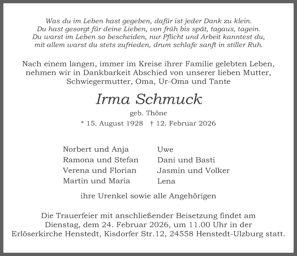 Hier finden Sie alle Traueranzeigen aus der Zeitung, die bisher für Irma Schmuck erschienen sind. Weitere Traueranzeigen, die in der Zeitung erscheinen, werden hier ebenfalls aufgelistet