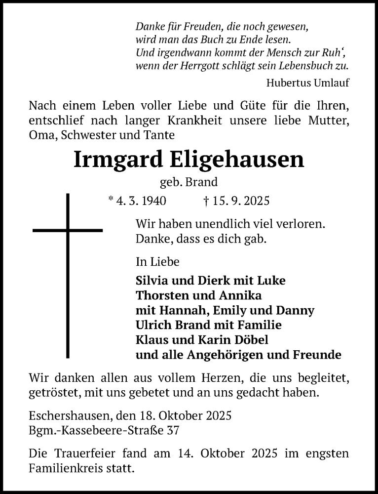 Hier finden Sie alle Traueranzeigen aus der Zeitung, die bisher für Irmgard Eligehausen erschienen sind. Weitere Traueranzeigen, die in der Zeitung erscheinen, werden hier ebenfalls aufgelistet