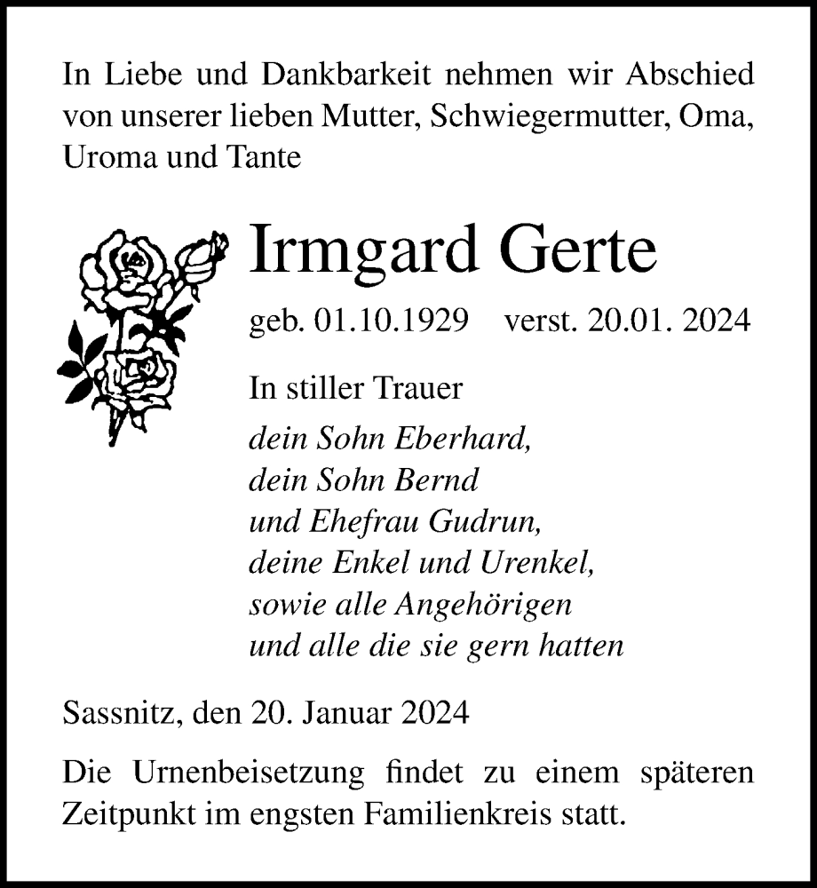 Hier finden Sie alle Traueranzeigen aus der Zeitung, die bisher für Irmgard Gerte erschienen sind. Weitere Traueranzeigen, die in der Zeitung erscheinen, werden hier ebenfalls aufgelistet