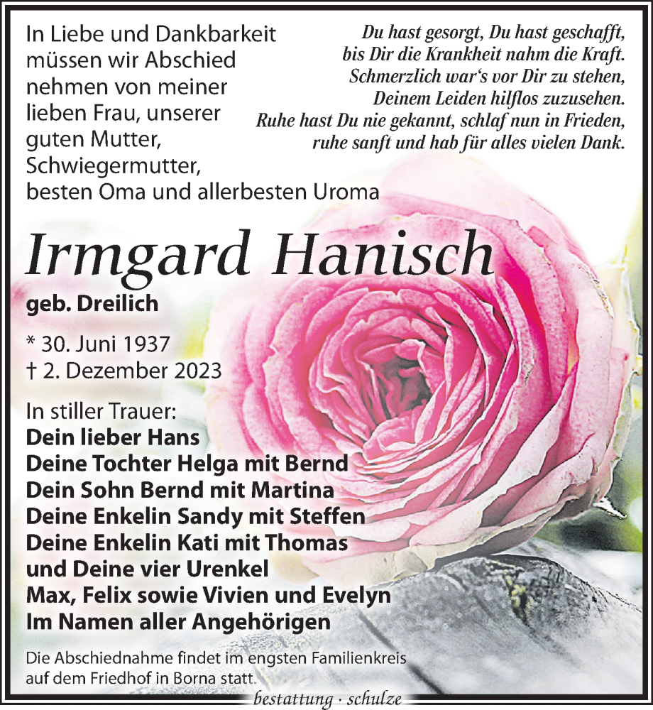 Hier finden Sie alle Traueranzeigen aus der Zeitung, die bisher für Irmgard Hanisch erschienen sind. Weitere Traueranzeigen, die in der Zeitung erscheinen, werden hier ebenfalls aufgelistet