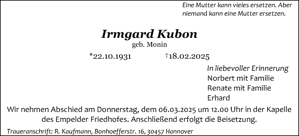Hier finden Sie alle Traueranzeigen aus der Zeitung, die bisher für Irmgard Kubon erschienen sind. Weitere Traueranzeigen, die in der Zeitung erscheinen, werden hier ebenfalls aufgelistet