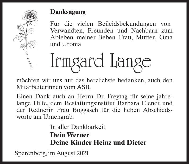 Hier finden Sie alle Traueranzeigen aus der Zeitung, die bisher für Irmgard Lange erschienen sind. Weitere Traueranzeigen, die in der Zeitung erscheinen, werden hier ebenfalls aufgelistet