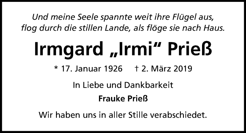 Hier finden Sie alle Traueranzeigen aus der Zeitung, die bisher für Irmgard Prieß erschienen sind. Weitere Traueranzeigen, die in der Zeitung erscheinen, werden hier ebenfalls aufgelistet