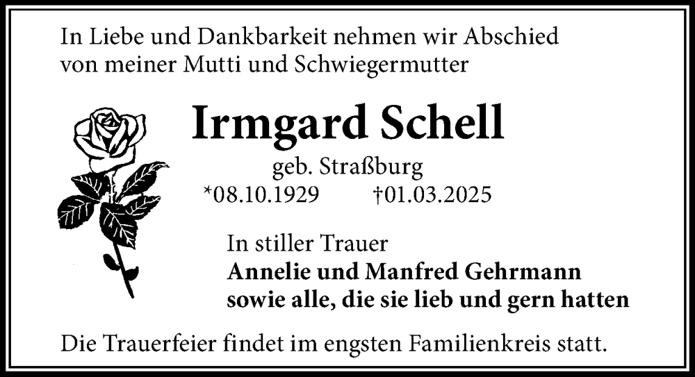 Hier finden Sie alle Traueranzeigen aus der Zeitung, die bisher für Irmgard Schell erschienen sind. Weitere Traueranzeigen, die in der Zeitung erscheinen, werden hier ebenfalls aufgelistet
