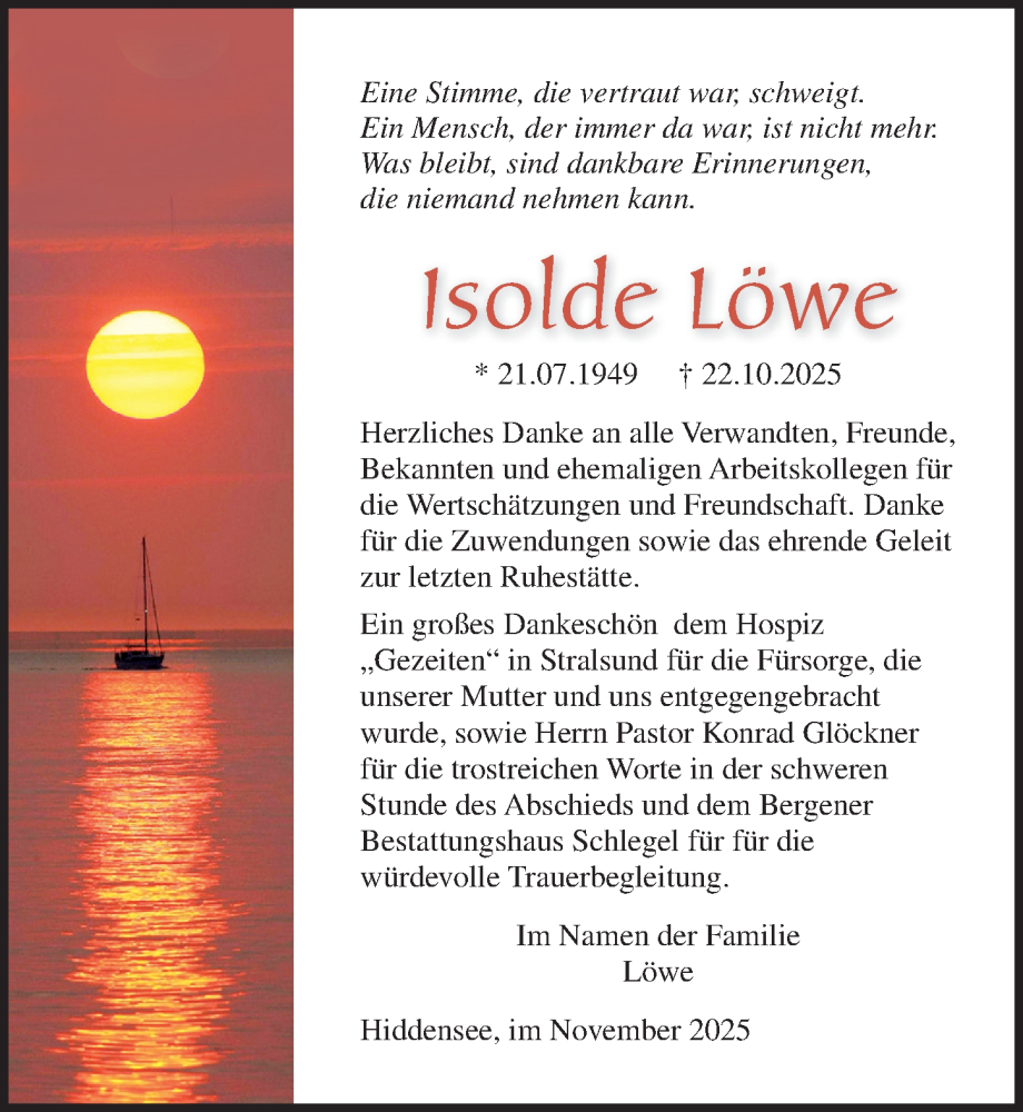 Hier finden Sie alle Traueranzeigen aus der Zeitung, die bisher für Isolde Löwe erschienen sind. Weitere Traueranzeigen, die in der Zeitung erscheinen, werden hier ebenfalls aufgelistet