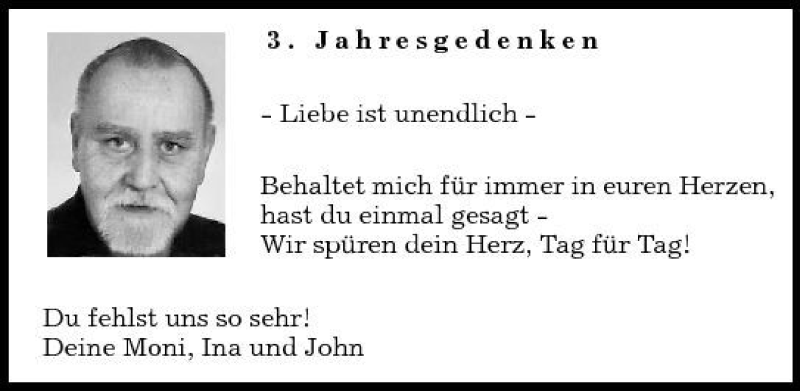 Hier finden Sie alle Traueranzeigen aus der Zeitung, die bisher für Jahresgedenken erschienen sind. Weitere Traueranzeigen, die in der Zeitung erscheinen, werden hier ebenfalls aufgelistet