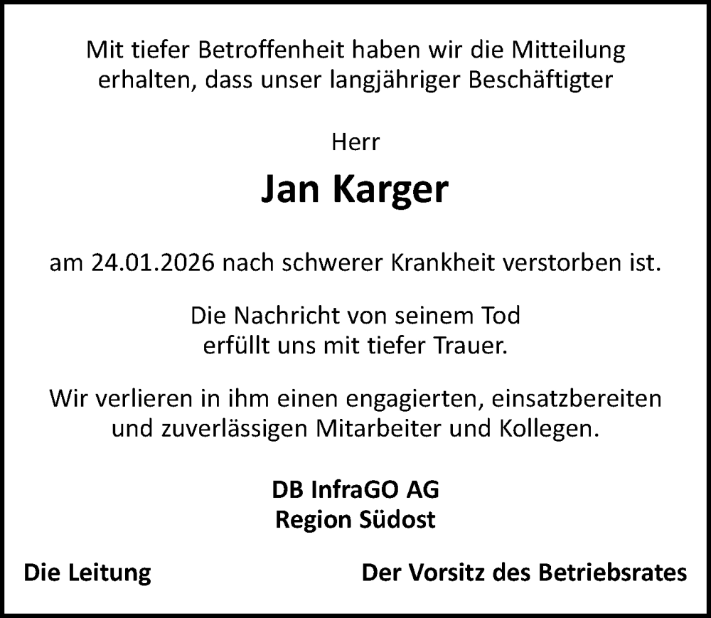 Hier finden Sie alle Traueranzeigen aus der Zeitung, die bisher für Jan Karger erschienen sind. Weitere Traueranzeigen, die in der Zeitung erscheinen, werden hier ebenfalls aufgelistet