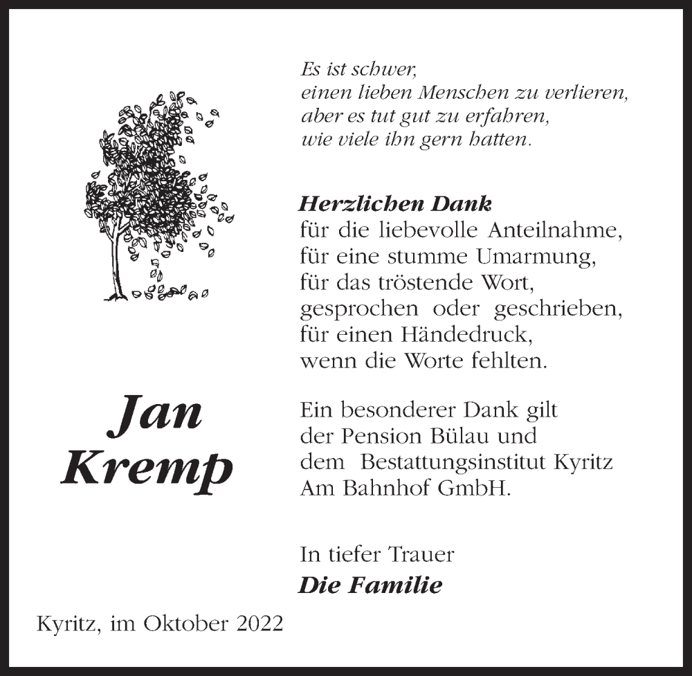 Hier finden Sie alle Traueranzeigen aus der Zeitung, die bisher für Jan Kremp erschienen sind. Weitere Traueranzeigen, die in der Zeitung erscheinen, werden hier ebenfalls aufgelistet