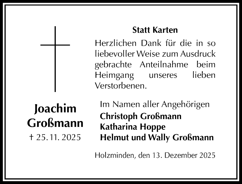 Hier finden Sie alle Traueranzeigen aus der Zeitung, die bisher für Joachim Großmann erschienen sind. Weitere Traueranzeigen, die in der Zeitung erscheinen, werden hier ebenfalls aufgelistet