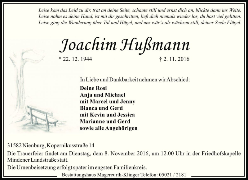 Hier finden Sie alle Traueranzeigen aus der Zeitung, die bisher für Joachim Hußmann erschienen sind. Weitere Traueranzeigen, die in der Zeitung erscheinen, werden hier ebenfalls aufgelistet
