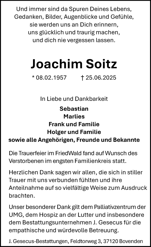 Hier finden Sie alle Traueranzeigen aus der Zeitung, die bisher für Joachim Soitz erschienen sind. Weitere Traueranzeigen, die in der Zeitung erscheinen, werden hier ebenfalls aufgelistet