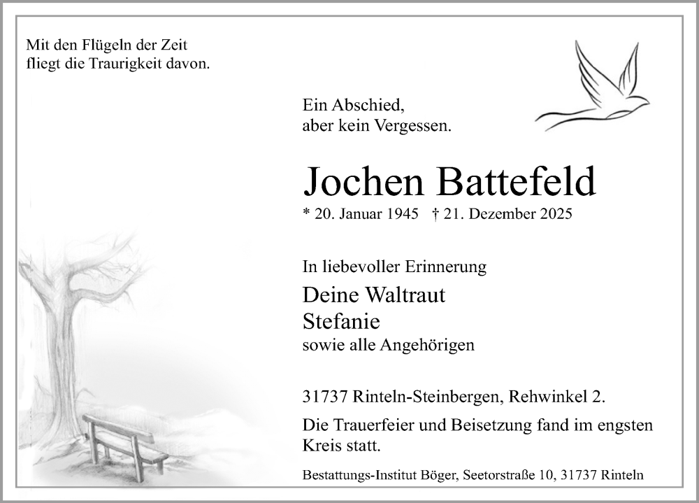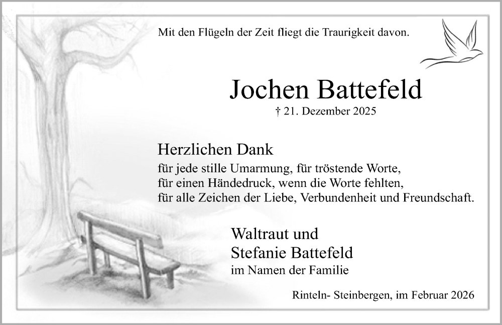 Hier finden Sie alle Traueranzeigen aus der Zeitung, die bisher für Jochen Battefeld erschienen sind. Weitere Traueranzeigen, die in der Zeitung erscheinen, werden hier ebenfalls aufgelistet
