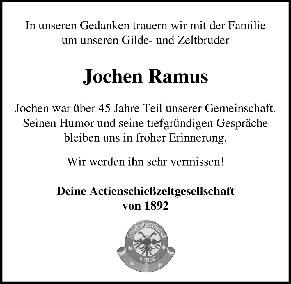 Hier finden Sie alle Traueranzeigen aus der Zeitung, die bisher für Jochen Ramus erschienen sind. Weitere Traueranzeigen, die in der Zeitung erscheinen, werden hier ebenfalls aufgelistet