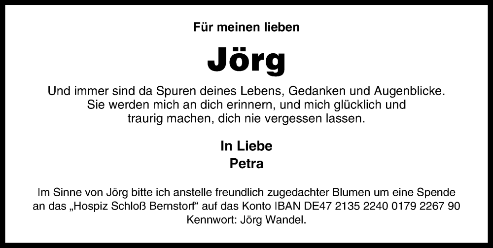 Hier finden Sie alle Traueranzeigen aus der Zeitung, die bisher für Jörg erschienen sind. Weitere Traueranzeigen, die in der Zeitung erscheinen, werden hier ebenfalls aufgelistet