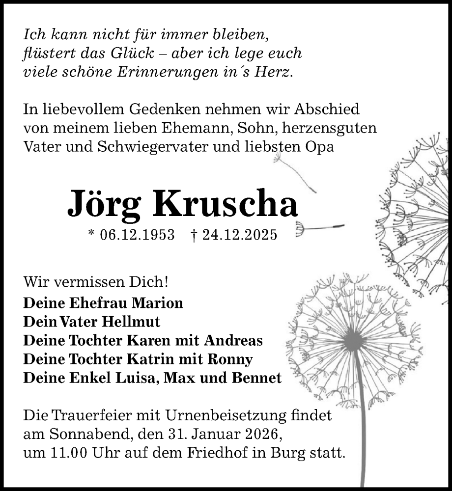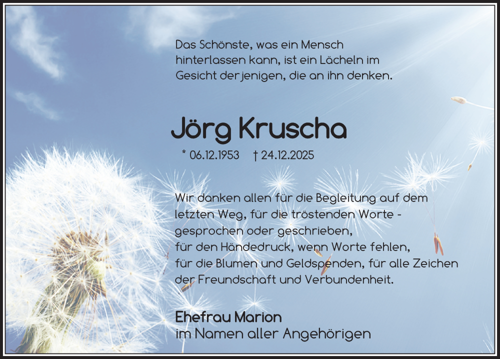 Hier finden Sie alle Traueranzeigen aus der Zeitung, die bisher für Jörg Kruscha erschienen sind. Weitere Traueranzeigen, die in der Zeitung erscheinen, werden hier ebenfalls aufgelistet