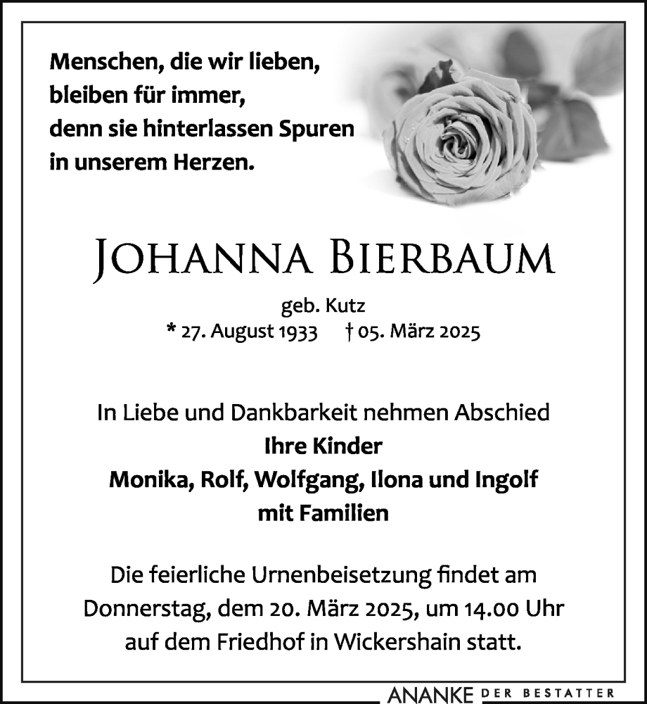 Hier finden Sie alle Traueranzeigen aus der Zeitung, die bisher für Johanna Bierbaum erschienen sind. Weitere Traueranzeigen, die in der Zeitung erscheinen, werden hier ebenfalls aufgelistet