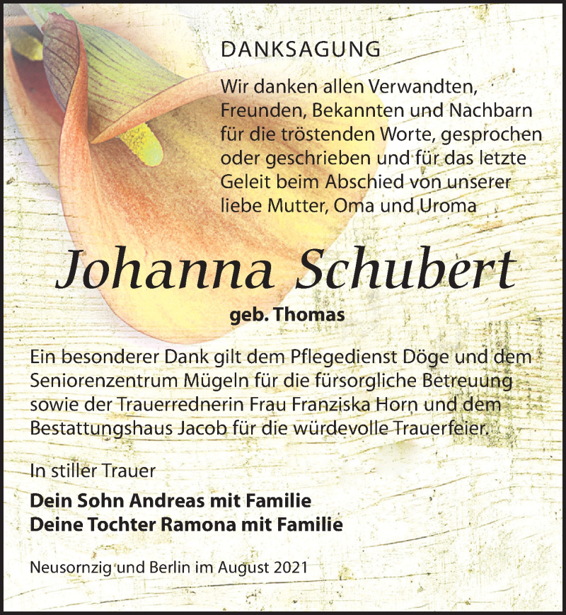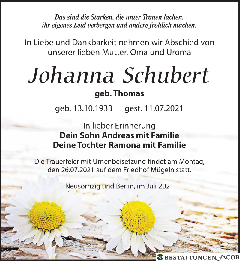 Hier finden Sie alle Traueranzeigen aus der Zeitung, die bisher für Johanna Schubert erschienen sind. Weitere Traueranzeigen, die in der Zeitung erscheinen, werden hier ebenfalls aufgelistet
