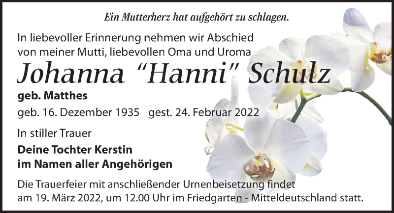 Hier finden Sie alle Traueranzeigen aus der Zeitung, die bisher für Johanna Schulz erschienen sind. Weitere Traueranzeigen, die in der Zeitung erscheinen, werden hier ebenfalls aufgelistet