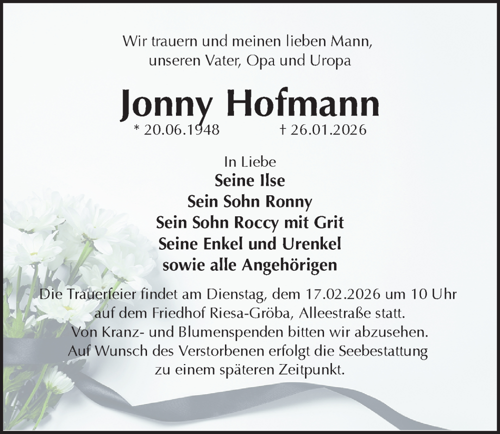 Hier finden Sie alle Traueranzeigen aus der Zeitung, die bisher für Jonny Hofmann erschienen sind. Weitere Traueranzeigen, die in der Zeitung erscheinen, werden hier ebenfalls aufgelistet