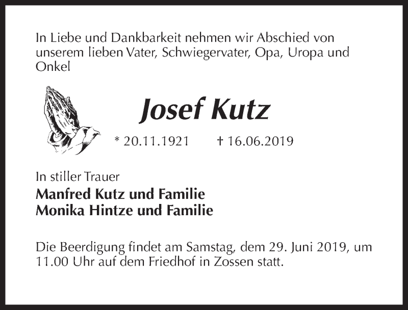 Hier finden Sie alle Traueranzeigen aus der Zeitung, die bisher für Josef Kutz erschienen sind. Weitere Traueranzeigen, die in der Zeitung erscheinen, werden hier ebenfalls aufgelistet