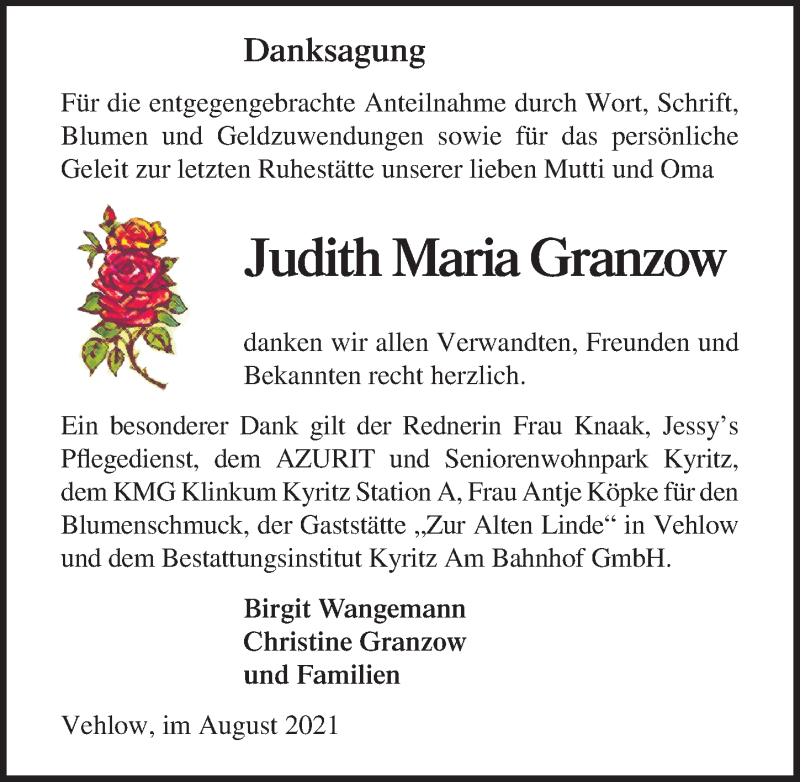 Hier finden Sie alle Traueranzeigen aus der Zeitung, die bisher für Judith Maria Granzow erschienen sind. Weitere Traueranzeigen, die in der Zeitung erscheinen, werden hier ebenfalls aufgelistet