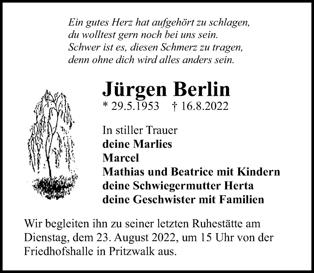 Hier finden Sie alle Traueranzeigen aus der Zeitung, die bisher für Jürgen Berlin erschienen sind. Weitere Traueranzeigen, die in der Zeitung erscheinen, werden hier ebenfalls aufgelistet