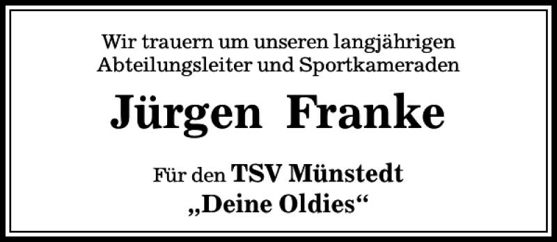Hier finden Sie alle Traueranzeigen aus der Zeitung, die bisher für Jürgen Franke erschienen sind. Weitere Traueranzeigen, die in der Zeitung erscheinen, werden hier ebenfalls aufgelistet