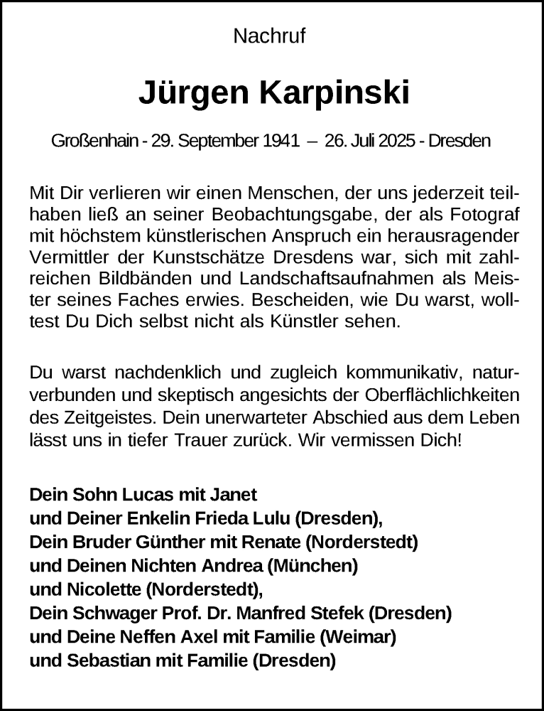 Hier finden Sie alle Traueranzeigen aus der Zeitung, die bisher für Jürgen Karpinski erschienen sind. Weitere Traueranzeigen, die in der Zeitung erscheinen, werden hier ebenfalls aufgelistet