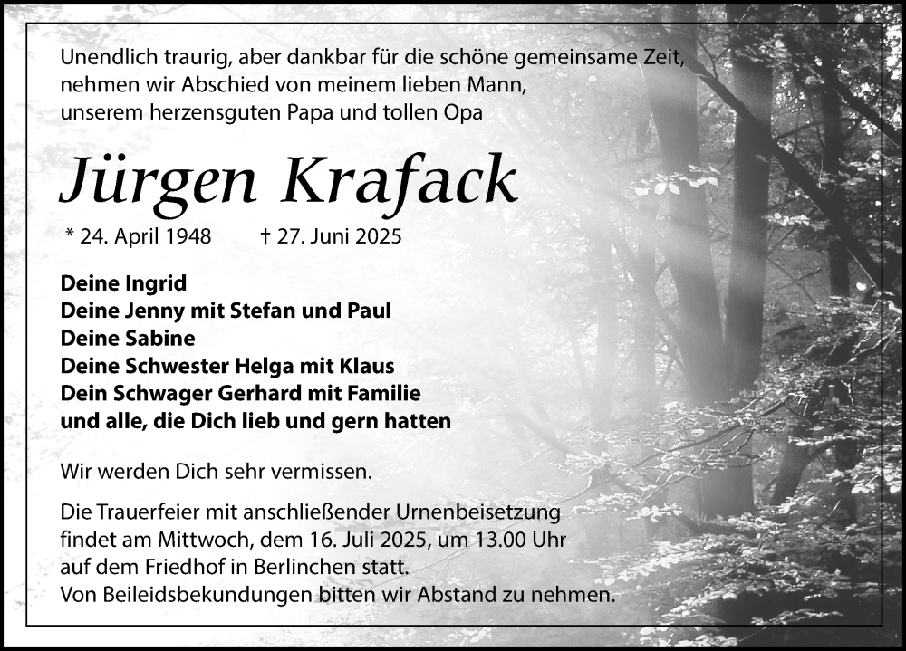 Hier finden Sie alle Traueranzeigen aus der Zeitung, die bisher für Jürgen Krafack erschienen sind. Weitere Traueranzeigen, die in der Zeitung erscheinen, werden hier ebenfalls aufgelistet