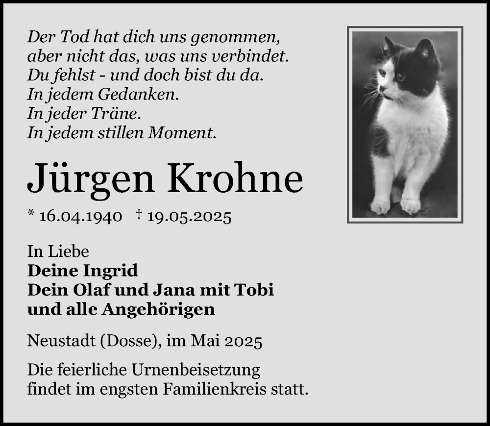 Hier finden Sie alle Traueranzeigen aus der Zeitung, die bisher für Jürgen Krohne erschienen sind. Weitere Traueranzeigen, die in der Zeitung erscheinen, werden hier ebenfalls aufgelistet