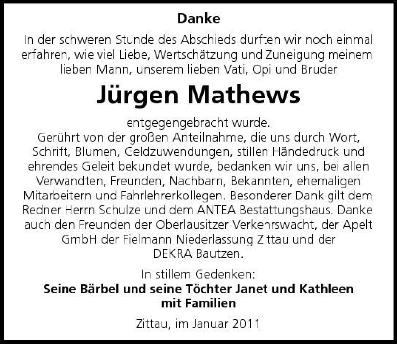 Hier finden Sie alle Traueranzeigen aus der Zeitung, die bisher für Jürgen Mathews erschienen sind. Weitere Traueranzeigen, die in der Zeitung erscheinen, werden hier ebenfalls aufgelistet