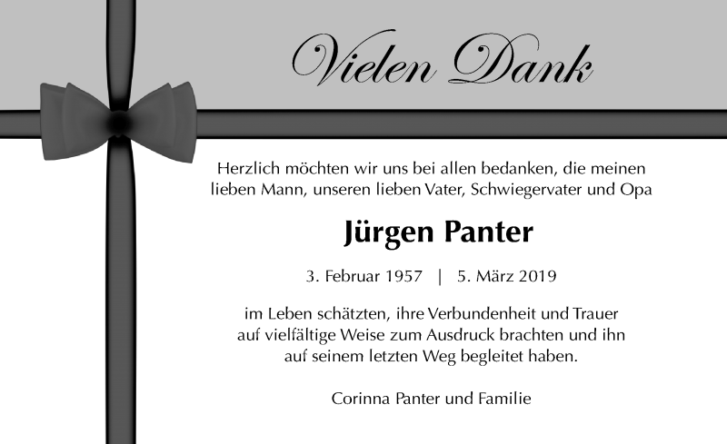Hier finden Sie alle Traueranzeigen aus der Zeitung, die bisher für Jürgen Panter erschienen sind. Weitere Traueranzeigen, die in der Zeitung erscheinen, werden hier ebenfalls aufgelistet