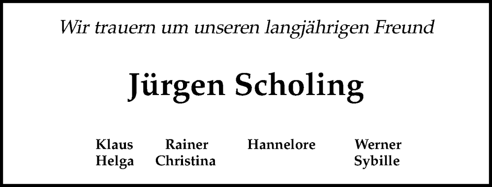 Hier finden Sie alle Traueranzeigen aus der Zeitung, die bisher für Jürgen Scholing erschienen sind. Weitere Traueranzeigen, die in der Zeitung erscheinen, werden hier ebenfalls aufgelistet