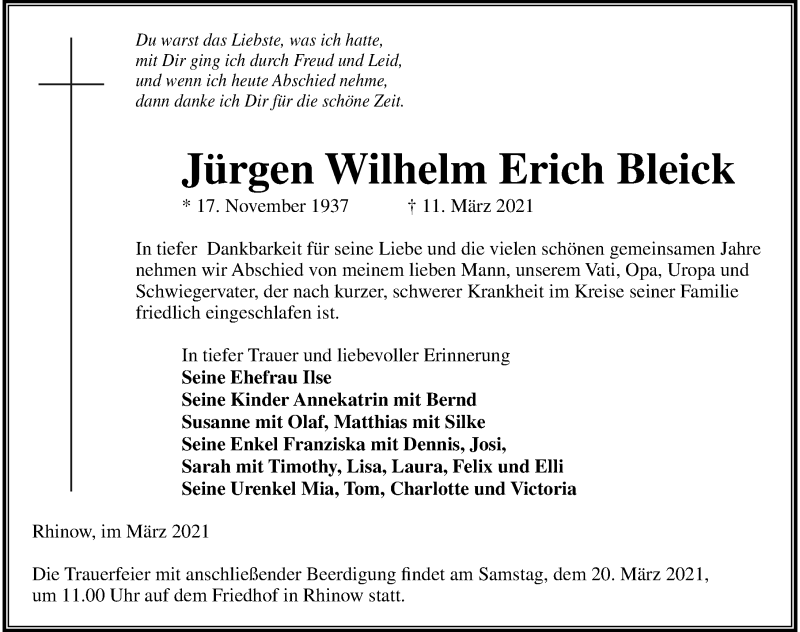 Hier finden Sie alle Traueranzeigen aus der Zeitung, die bisher für Jürgen Wilhelm Erich Bleick erschienen sind. Weitere Traueranzeigen, die in der Zeitung erscheinen, werden hier ebenfalls aufgelistet