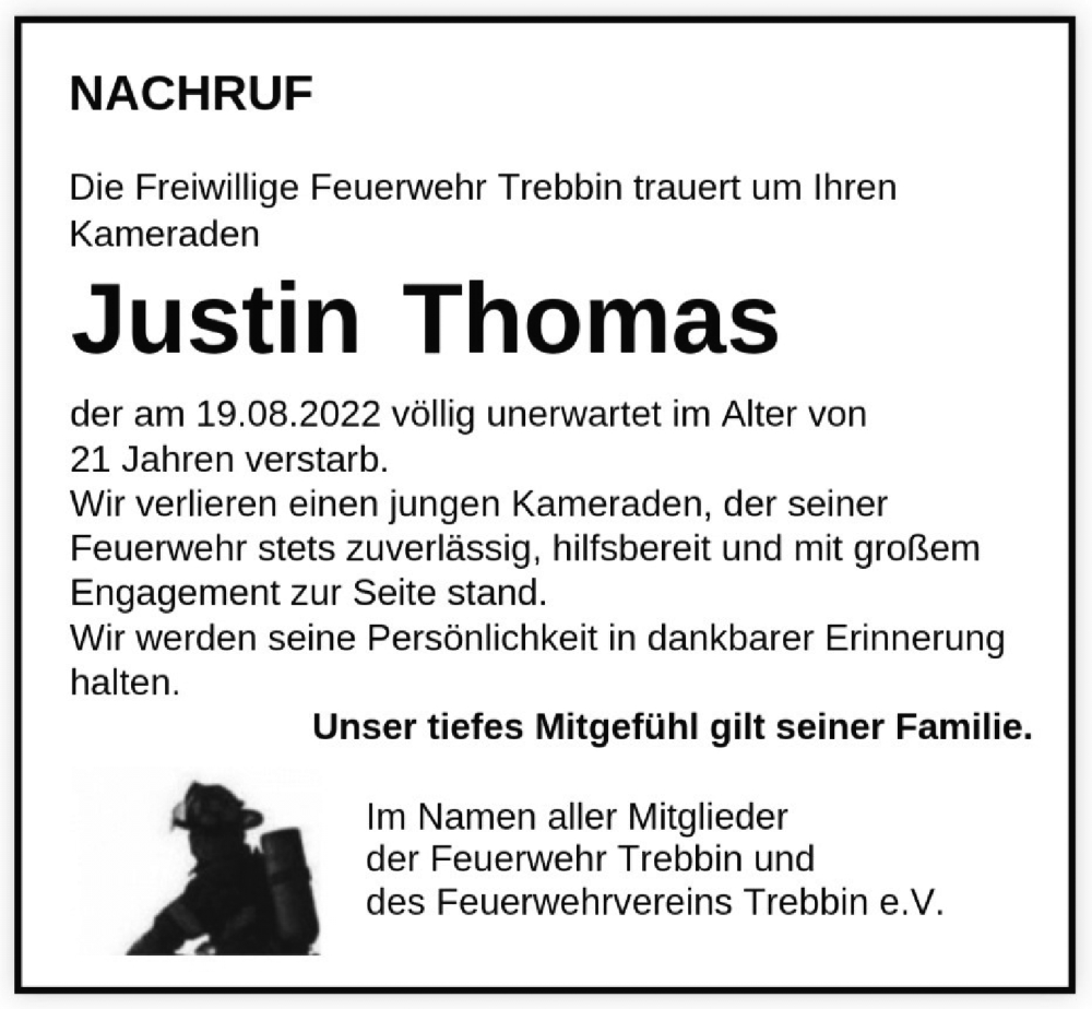 Hier finden Sie alle Traueranzeigen aus der Zeitung, die bisher für Justin Thomas erschienen sind. Weitere Traueranzeigen, die in der Zeitung erscheinen, werden hier ebenfalls aufgelistet
