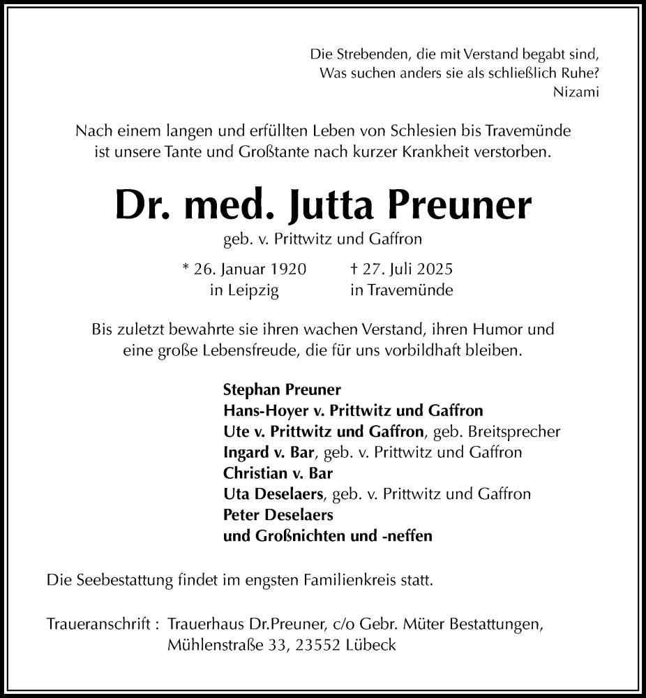 Hier finden Sie alle Traueranzeigen aus der Zeitung, die bisher für Jutta Preuner erschienen sind. Weitere Traueranzeigen, die in der Zeitung erscheinen, werden hier ebenfalls aufgelistet