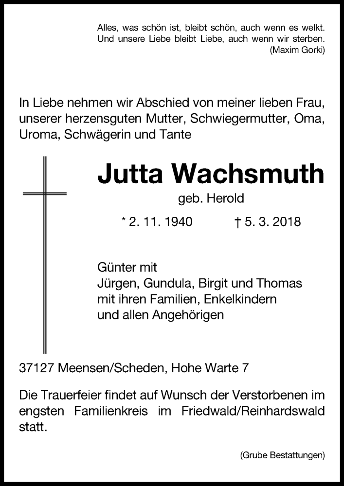 Hier finden Sie alle Traueranzeigen aus der Zeitung, die bisher für Jutta Wachsmuth erschienen sind. Weitere Traueranzeigen, die in der Zeitung erscheinen, werden hier ebenfalls aufgelistet