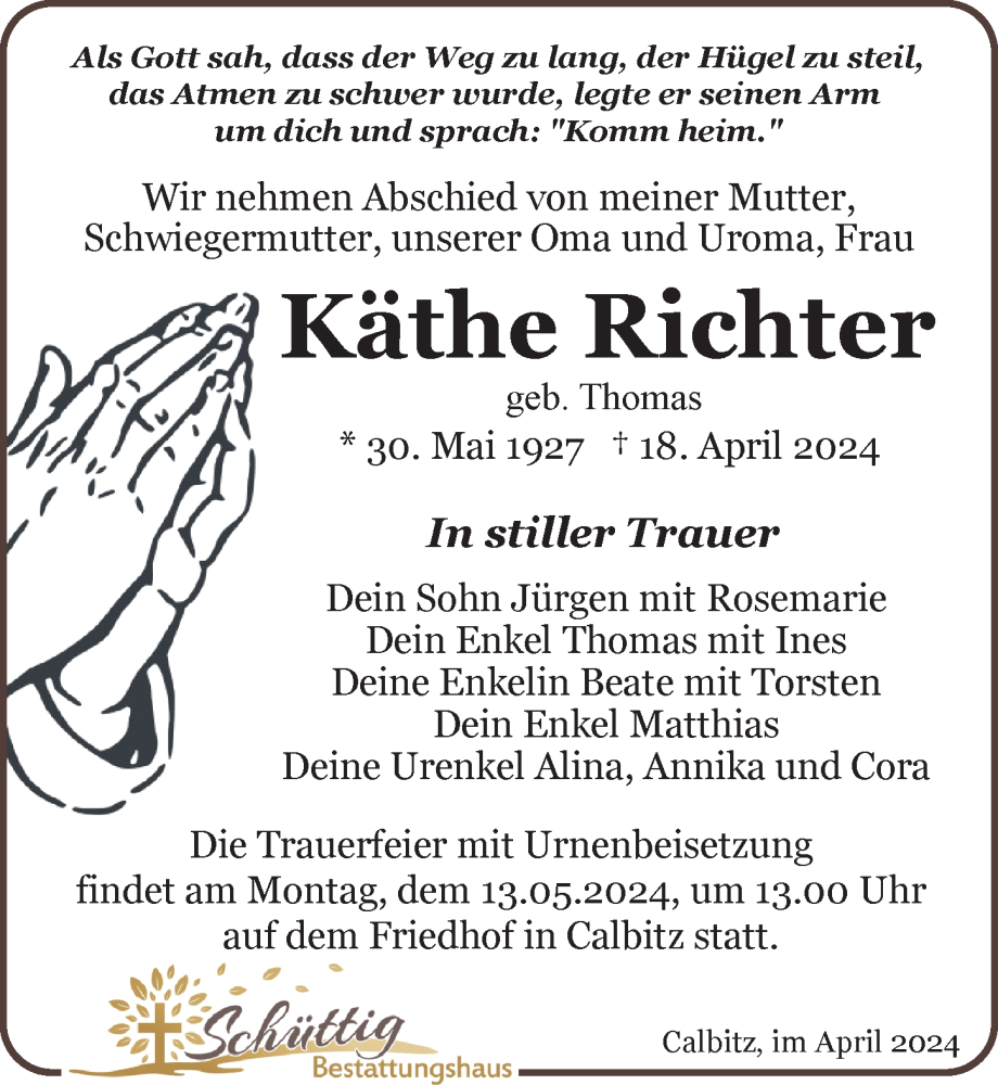 Hier finden Sie alle Traueranzeigen aus der Zeitung, die bisher für Käthe Richter erschienen sind. Weitere Traueranzeigen, die in der Zeitung erscheinen, werden hier ebenfalls aufgelistet